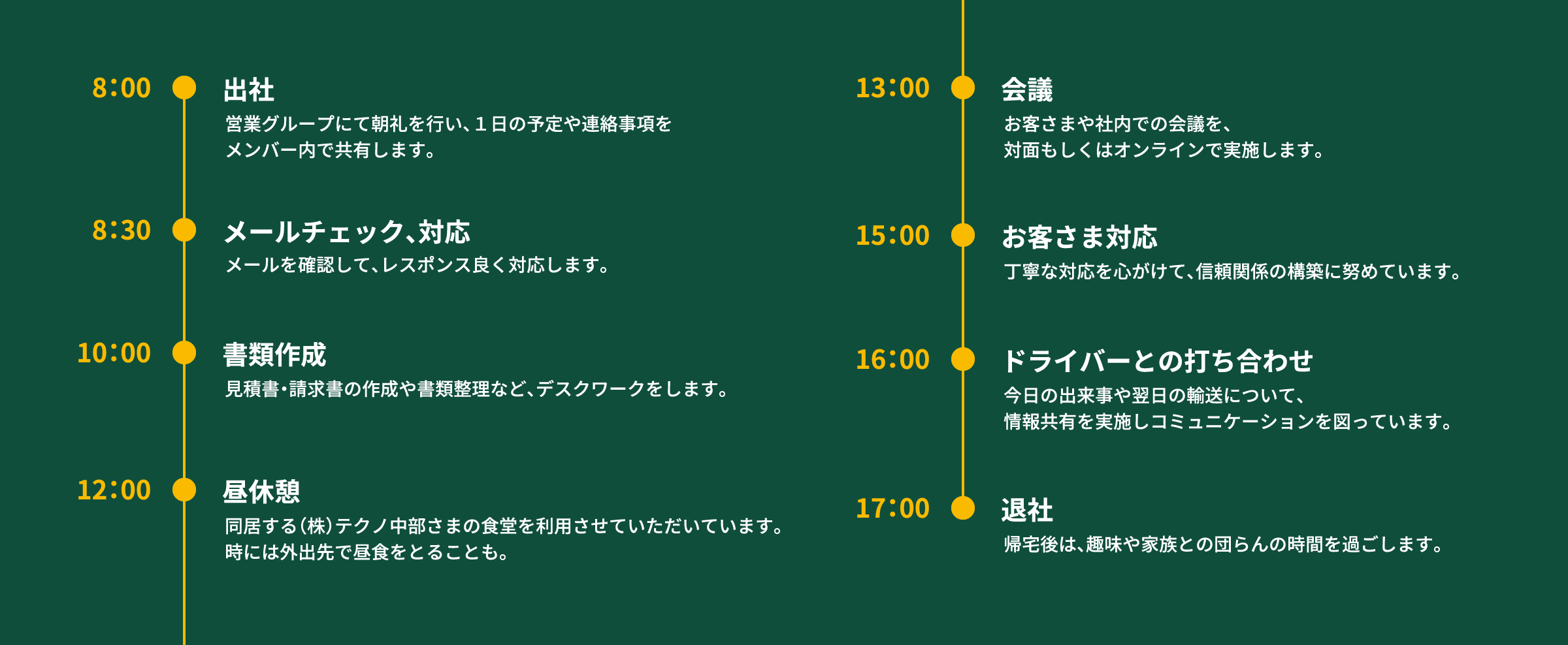 営業はお客さまとやり取りを行う、いわば会社の顔です。ときに現場で立ち合いをすることもありますが、コミュニケーションの第一歩として、しっかり挨拶するようにしています。営業だけではないかもしれませんが、挨拶がきちんとできれば大丈夫ですよ!