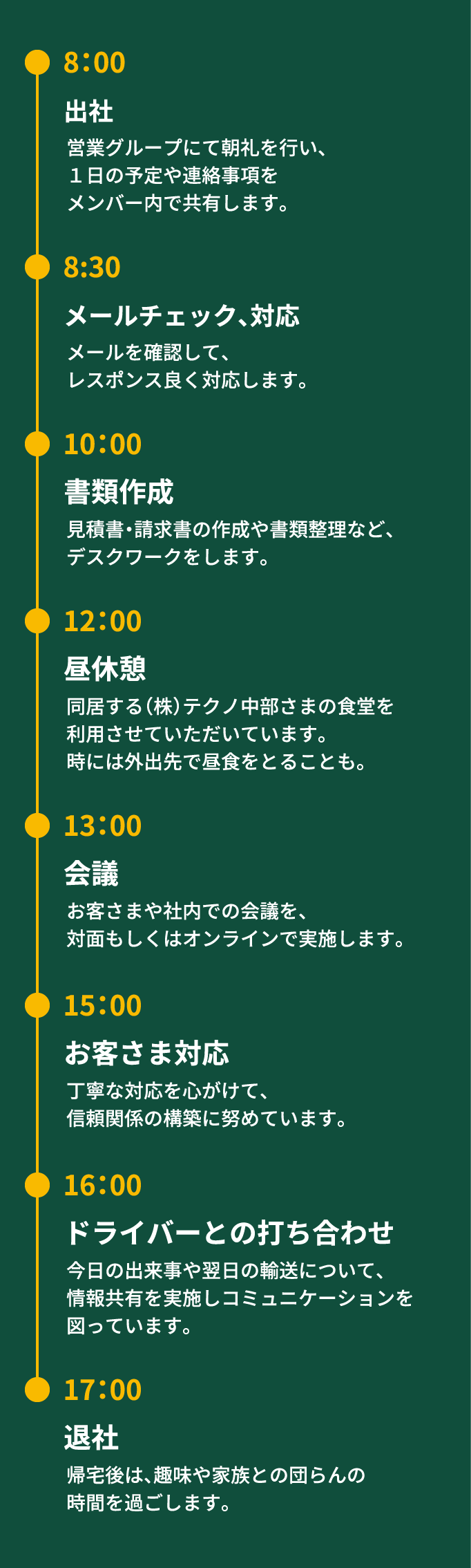 私たちのお客さまは、主に中部電力グループの企業です。そのため、新規顧客の開拓というより既存のお客さまから輸送依頼をいただき車両の手配をすることが、私の主な業務です。さらに物流改革など事業領域の拡大のため、お客さまや協力会社さまとコミュニケーションをとることもあります。