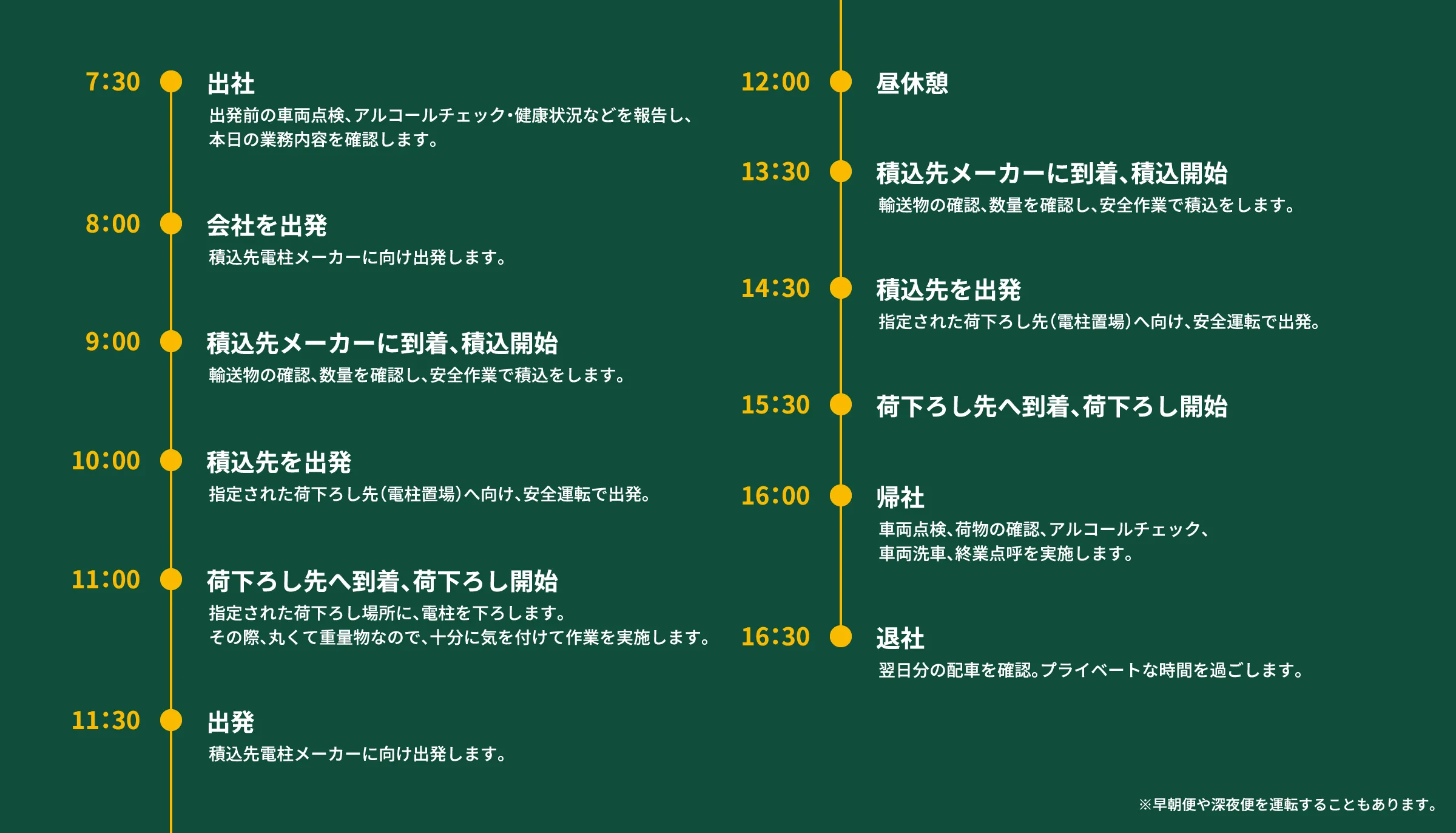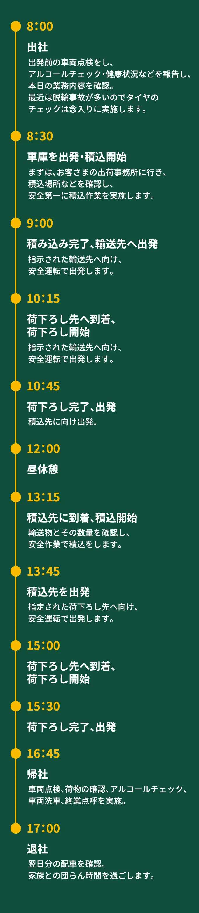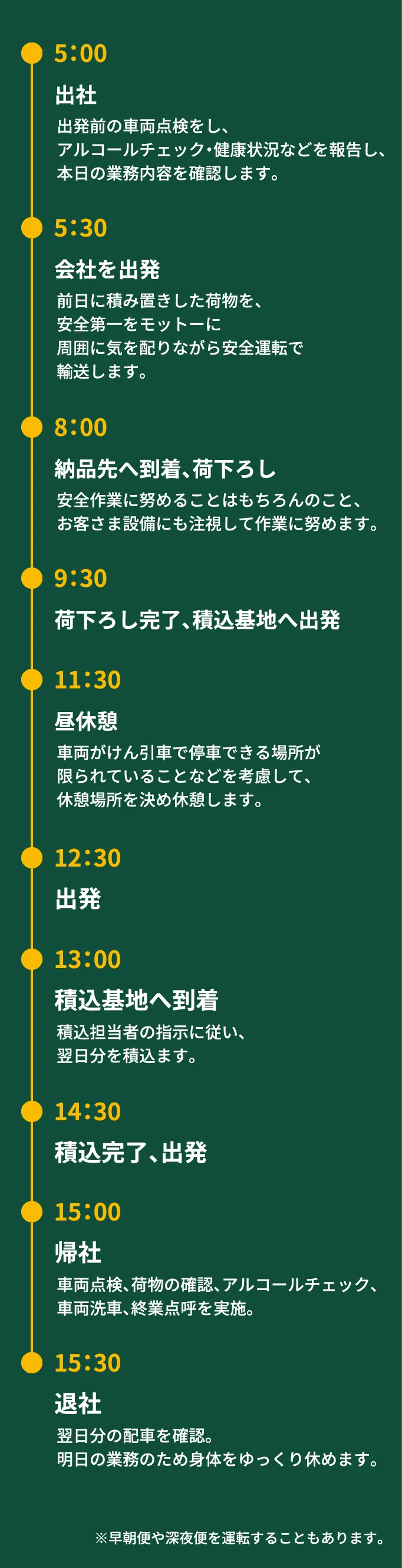 ドライバーは一人で完結する仕事かと思いきや、協調性が求められると実感しました。他のドライバーや協力会社の方と同じ目的地へ向かうことも多く、到着後の作業を考えてどういう順番で出発するのがいいのか…など、細かい気遣いができる人と一緒に働きたいです!