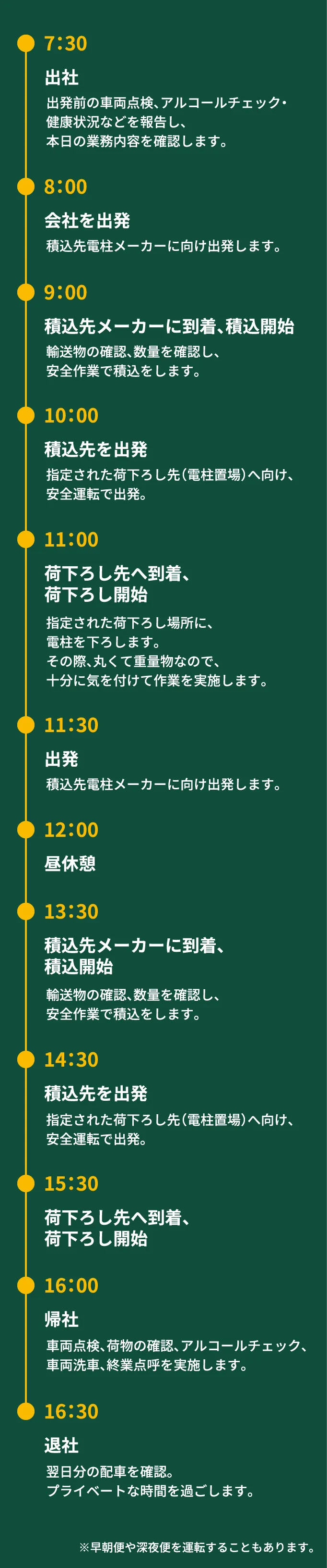 碧南営業所では、ほとんどの仕事が碧南火力発電所からの輸送。大型免許さえあればできる仕事ばかりです。その人のレベルに応じたゆとりのある運行計画を組んでもらえるので、時間に追われることがありません。たいてい計画通りに勤務できるので、プライベートの予定も立てやすいですね。
